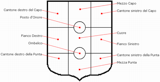 Lo scudo, supporto materiale del blasone, ha forme diverse a seconda del luogo e dell’epoca. Uno scudo è sempre descritto dal punto di vista del portatore. La destra araldica è dove è il suo braccio destro, chiamata Dexter, la sinistra è detta Sinister. Quindi nei disegni degli stemmi destra e sinistra sono invertite. Lo scudo viene ripartito in 9 sezioni, dividendolo prima dall’alto in basso mentre orizzontalmente si inizia dal centro seguendo a sinistra e poi a destra.